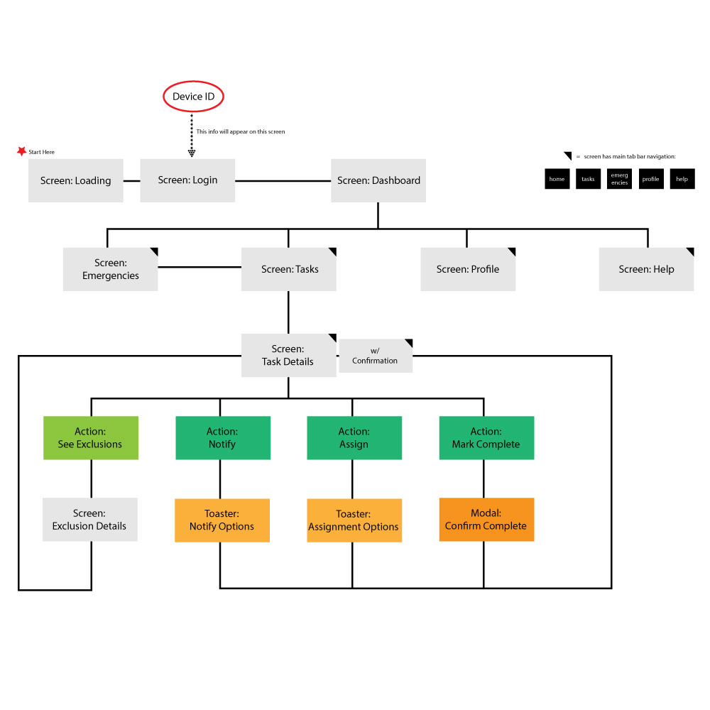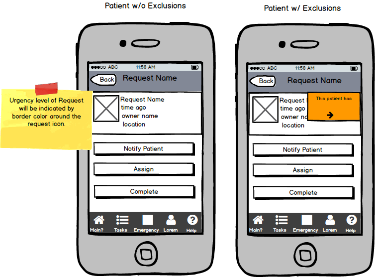 Wireframe for Tasks ScreenVIEW LARGERA wireframe showing the early stages for the Tasks screen that allows the health care provider to take action -
